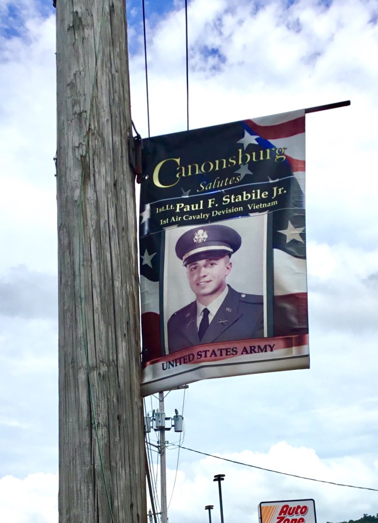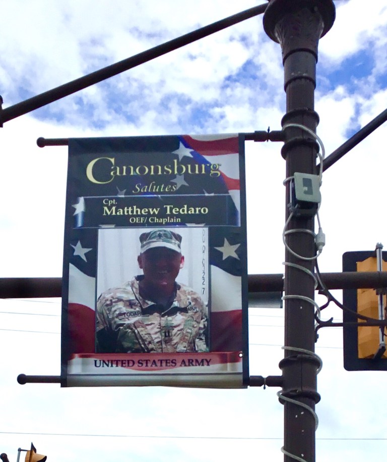 Here are just three of maybe 100 banners gracing the length of the main street of Canonsburg, Pennsylvania. The town wanted to honour his hometown heroes; families purchase the banners and supply the photos. The proceeds go to downtown revitalization. The banners will remain up three Labour Day. I’ve not seen this kind of solution before; I like it, and I would have to say it is a uniquely American form of celebration.