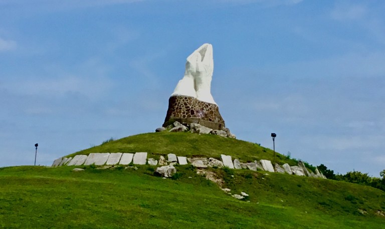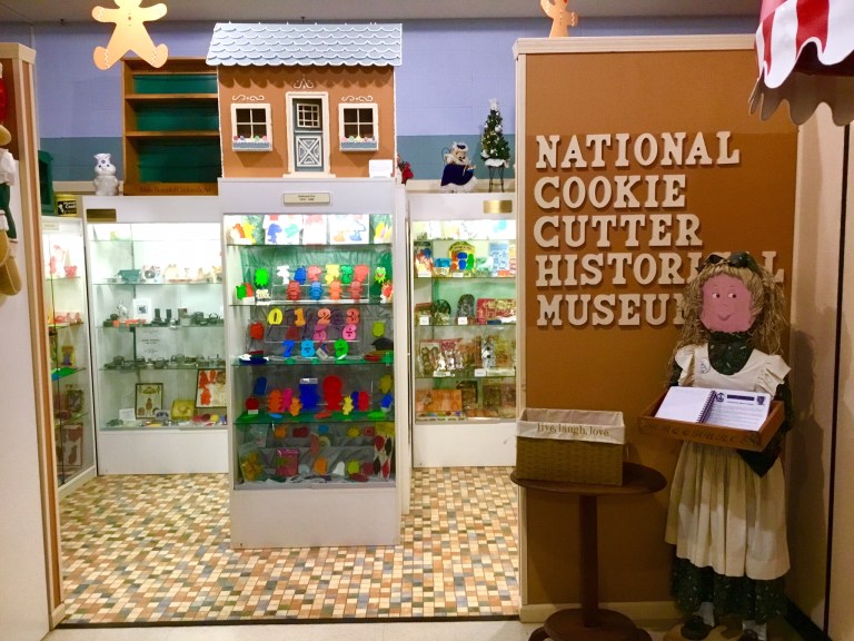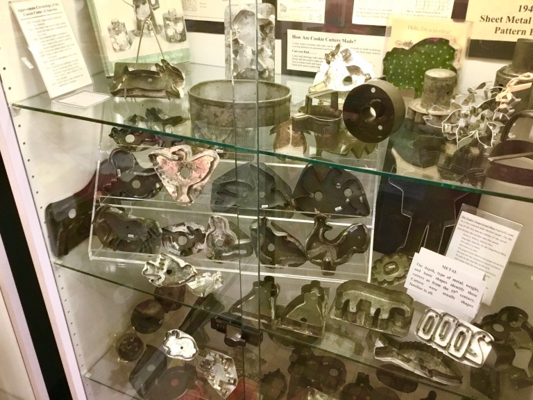 I don’t think I’m passionately religious, but I am somehow, sometimes drawn to these overt Christian demonstrations of faith. Remember the huge cross a few days ago? This morning, my waitress at the Waffle House tipped me to this particular site; it has certainly not been on my list, but I had to go see. The praying hands have been around since 1972. The sculpture weighs 100 tons and is made principally of white stucco over a steel skeleton. It is in King Jack Park, a rather remarkable municipal park in Webb City, Missouri, just north of Joplin. A stone sign at the base of the hands says simply “hands in prayer; world at peace.” King Jack Park is a huge municipal park that includes a farmers market that runs late Tuesday afternoon, early Thursday morning, and mid day on Saturday – so there’s no excuse for someone to not take advantage of the market at some point during the week. The park also includes a restored trolly from the old trolly days in Joplin that gives rides on a track around the park. There are picnic areas, ball diamonds, expansive lawns and more. This has been a recurring theme in many areas – the scope of the municipal park lands in various communities. Meanwhile, the one thing I really stopped in Joplin to see actually took me no time at all. The Joplin museum complex encompasses three museums, the smallest of which is the National Cookie Cutter Historical Museum. As you can see from the top picture, it’s really just a collection of cookie cutters on glass shelves in a very small room. There is very little signage to explain what you’re looking at – the original cookie cutters, the aluminum display of cookie cutters from the 1920s to the 1940s; there are Peanuts cookie cutters, Christmas cookie cutters, red plastic cookie cutters, etc., etc., etc.