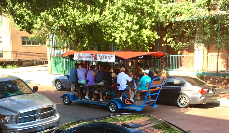 Back in Oklahoma City, in the Bricktown district, I needed a bite to eat. I was coming out of the Bricktown Brewery (wings!) when I saw this pedal bar. I have seen one of these in Nashville; now I wonder how many cities have them. It’s a travelling bar and all the people on the whatever-it-is are drinking- but they have to pedal to propel themselves through the district. I’m sure it’s a scenic tour, but I wonder how blurry the final attractions seem to be.