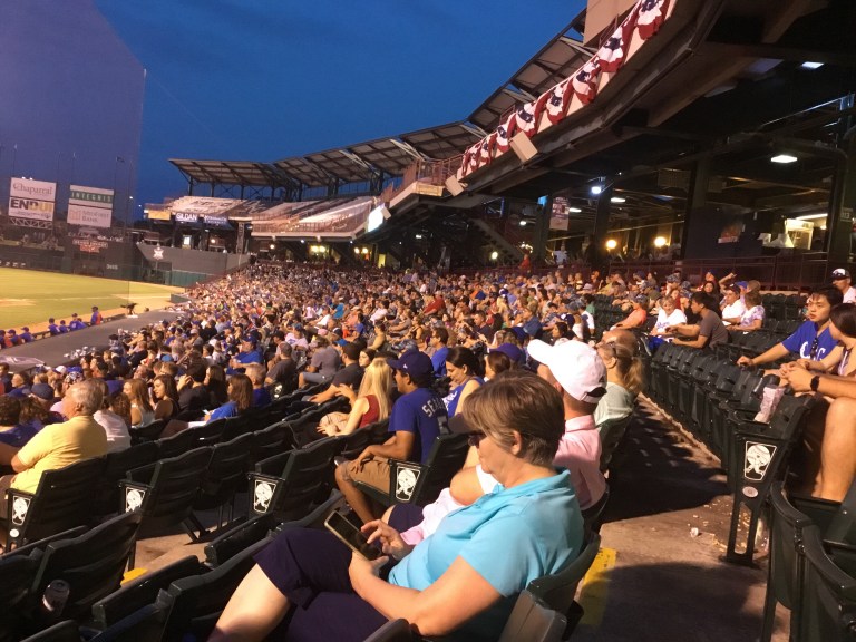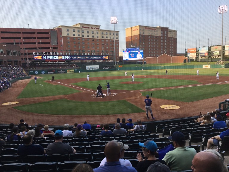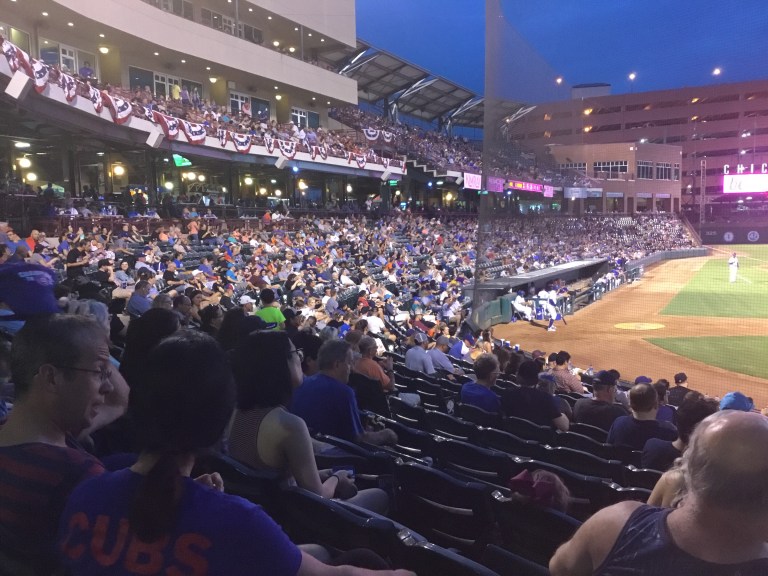 I had a great seat – you can see where I was relative to home plate, and I was the only person in my row! But as you can see from the first two pictures, the game was well attended. First game of a three-game set, the Oklahoma City Dodgers versus the Iowa Cubs. The home team won 6-4 in 11 dramatic innings.