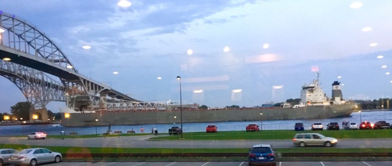 No, I didn’t take a picture at every restaurant; not every restaurant I ate at was as remarkable as, say, Wilder’s, or the Cattleman’s Cafe in Oklahoma City. But on the way home, on my last night out, I was eating at Freighters, at the Doubletree Hotel in Port Huron Michigan. I had no sooner sat down to eat then a Great Lakes freighter came by! There is a beauty to the Great Lakes freighters that is unlike those big bulky slabs anchored outside the ocean ports like Vancouver, or Long Beach, etc. This is the St. Clair River; to the left just under that bridge is Lake Huron, second largest of the Great Lakes. That’s the Bluewater Bridge; it will take me home Tuesday morning! But ya gotta admit… a boat in the ditch is a nice way to finish up!