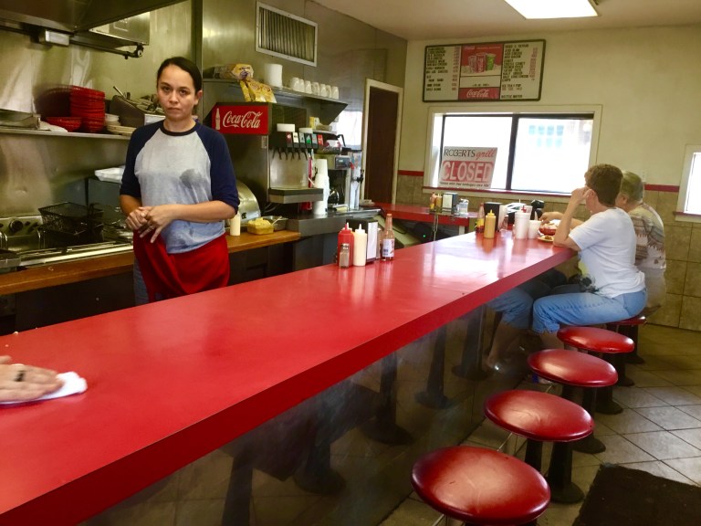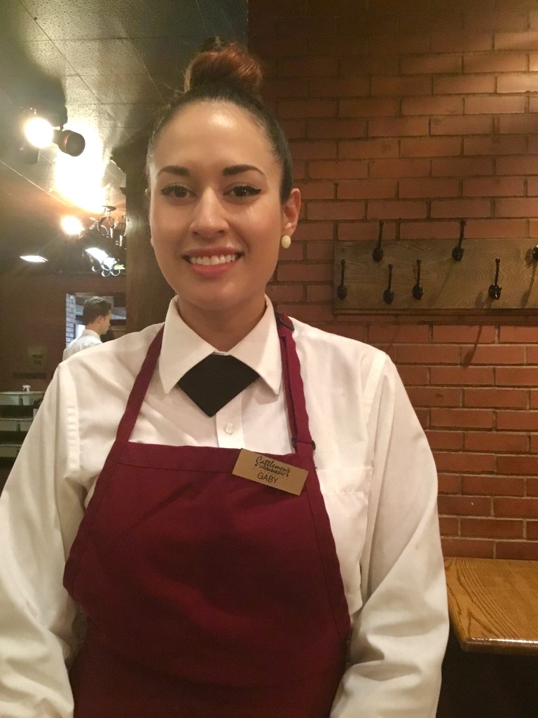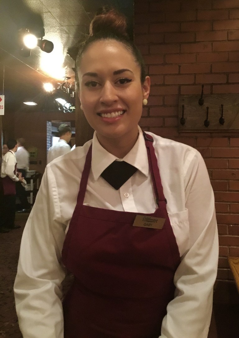 Langston’s is across the street from the 100 year old Cattleman’s Café, probably the most iconic restaurant in Oklahoma City and one of the three “must”s of a visit to the community. This gentleman was coming out as I was going in, and I simply said to him “I like your shirt!” He thanked me in a voice that was accented, and I asked where he was from; “Gabon” was his answer. I asked if I could take his picture; he said,”Do you want me to wear the hat too?” I had not noticed the hat in his hand! I said, “you bet!”… And this is the result. I have no idea who he is. I was not gathering facts; the photo was an impulse. I just liked the look of him. Two waitresses. I think you could take photographs of wait staff in restaurants all day long; they are some of the hardest working, longest suffering people I know. The first picture is Gaby, my waitress at the Cattlemen’s Cafe in Oklahoma City. The nice thing about this restaurant, which is really an exceptional steakhouse, is that it has no airs or pretensions of any kind. You can dress for dinner – or not. You can be formal, or not. And one of the exceptional things about Gaby was her quietly welcoming manner, making sure practically before I was seated, wearing a logo T-shirt, was that I was among friends, that I was good. The people sitting next to me were certainly more formally dressed than I was; made no difference to my waitress. She was professional, friendly, courteous… Probably one of the best I have encountered.