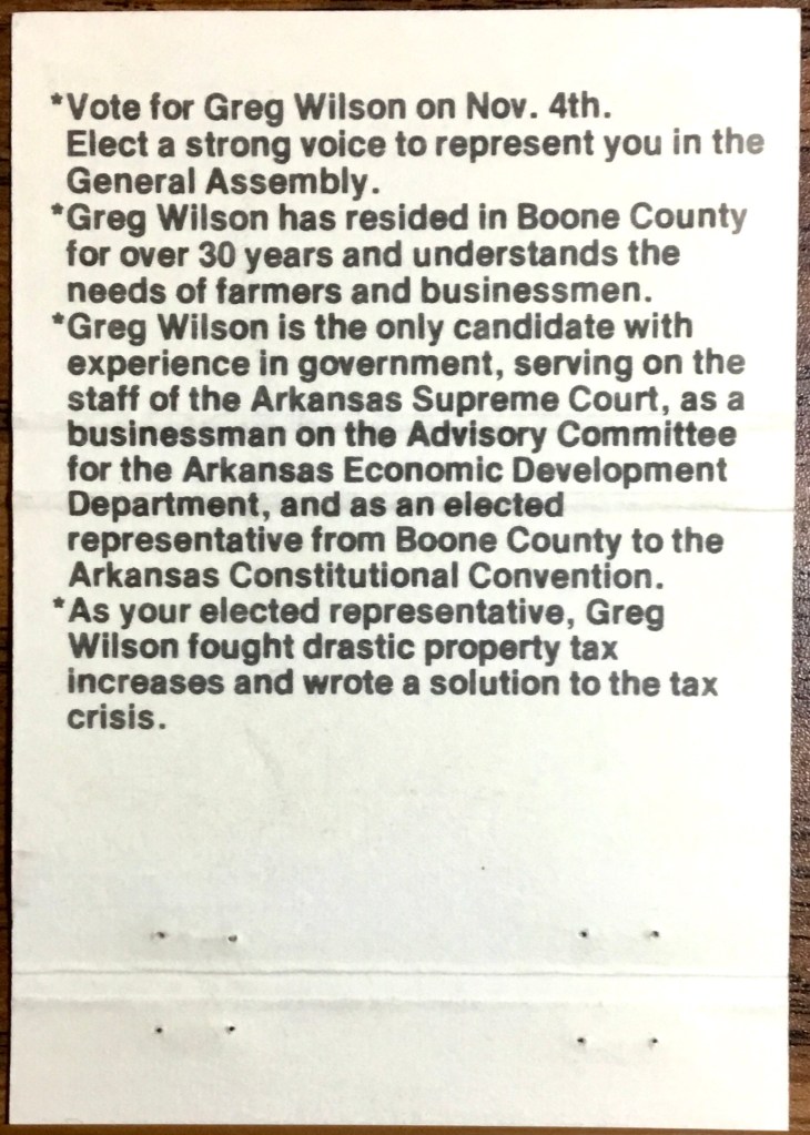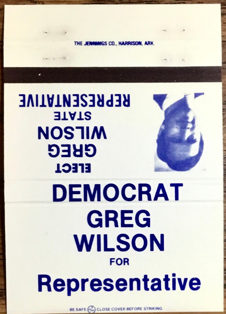 And so it is with Greg Wilson; running as a Democrat for the Arkansas State Legislature, he apparently didn’t get the votes — this despite quite a self-described record of accomplishment that we find inside the matchcover. So what do we know?