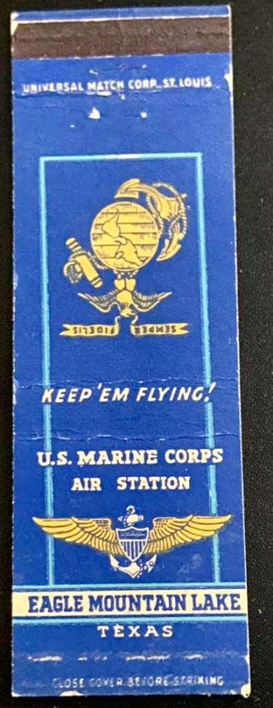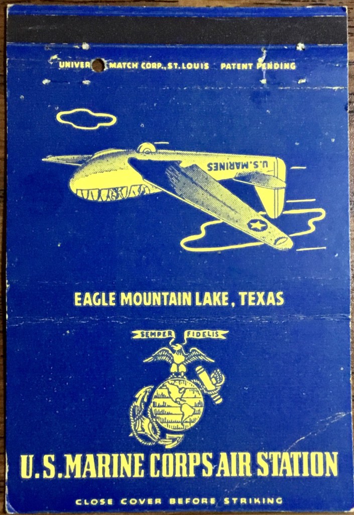 The base became a Naval Air Station (another matchcover!) but then reverted back to the Marine Corps in 1944.as a dive bombing school. In December of 1944 Eagle Mountain Lake became a night fighter school. Primary aircraft for you buffs were the Grumman F6F Hellcat and the F7F Tigercat.