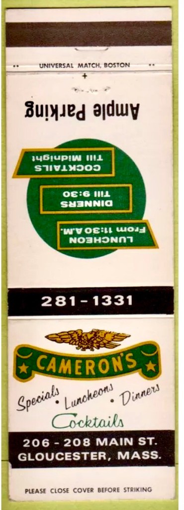 It opened in 1936. It was sold in 2015 and demolished in 2020. It was Cameron’s a more than 13,000 square foot restaurant a few minutes’ walk from the famous fishing port in Gloucester, Massachusetts, northeast of Boston. I know of at least two different 20-strike matchcovers for Cameron’s a front strike and a rear strike.