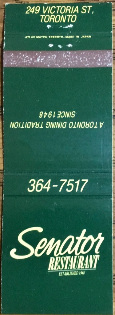 It says so right on the matchcover itself — “A Toronto Dining Tradition”, and so it is. The Senator is one of the oldest continuously operating restaurants in Toronto.