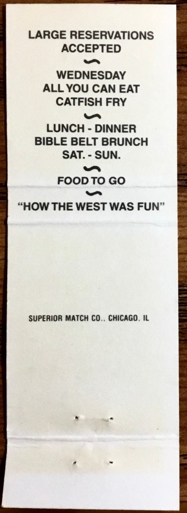 This is the only matchcover I can find for Cowgirl. There are lots with cowgirls on them if that’s a category for you, but this is it for the restaurant. (It’s a woody,, too!) Nor could I find any for Sherry’s other restaurants, but now the search is on.