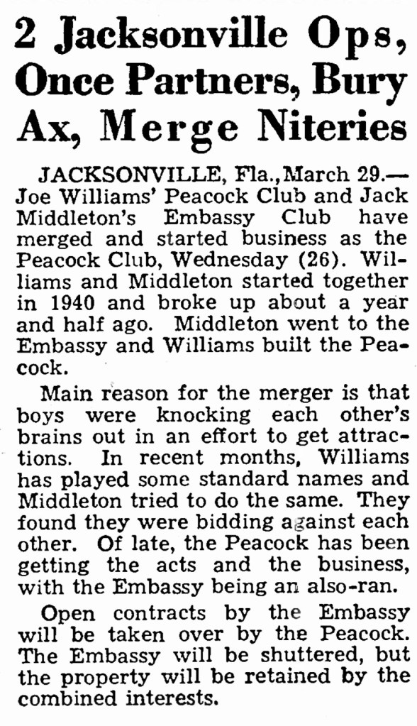 He had been a partner with Jack Middleton until they parted ways and Joe Williams opened his Peacock Club in. October 1944, to turn-away business. Sunny Dunhams orchestra was among the opening week acts.