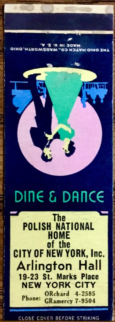 The Polish National Home of The City of New York was established on New York’s Lower East Side in 1920 (there had been another in Brooklyn since 1914) . The area had been predominantly German since before the Civil War. The property itself had been built in 1833 and gone through a series of uses as a music hall and then in 1888, a ballroom, Arlington Hall. It may have had a richer history then, hosting a president (Teddy Roosevelt), a publisher (Hearst) and even a gangster shoot out!