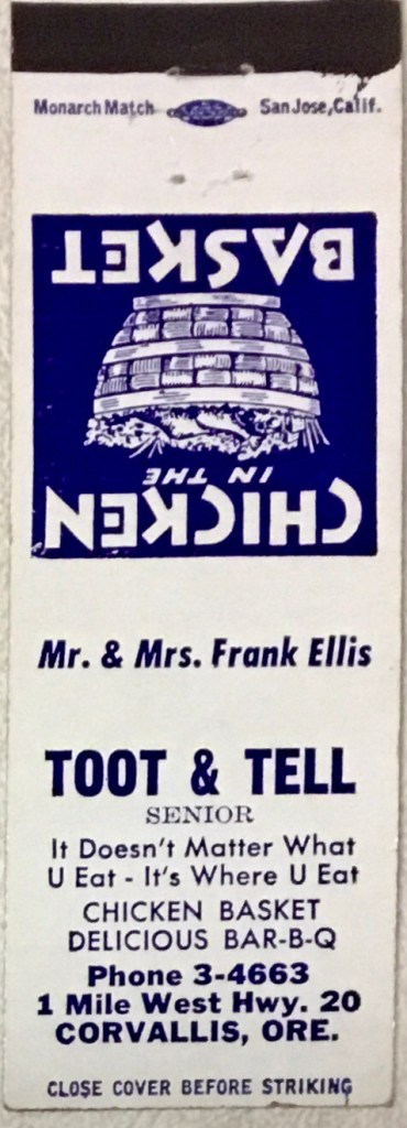 “Toot & Tell”, or some variation on that name, is an oft-repeated restaurant name in America. There was one in Beloit, Wisconsin, and another in Garner, North Carolina that opened in 1946 and closed in 2021 after the owner died. I think there was another one in Defiance, Ohio and in Williamsburg down east of Cincinnati. And this one, in Corvallis, Oregon.