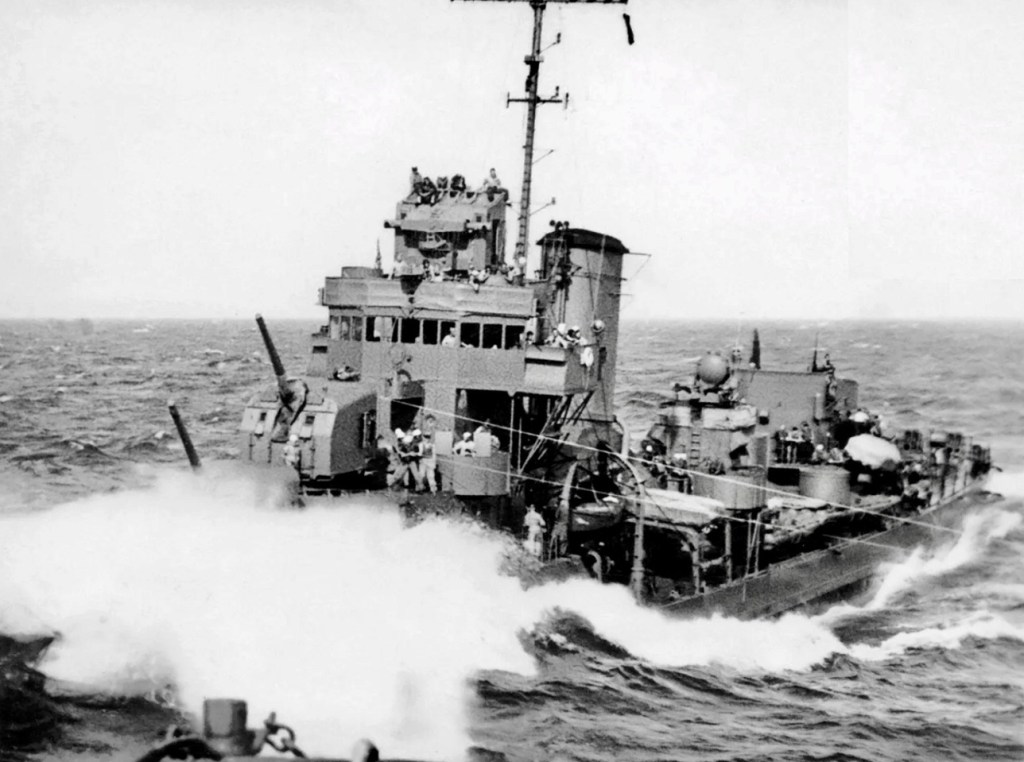 “Mugs” was repaired in Sydney and back on patrol in the fall of ’42; I want to say at this point that there are some great detailed histories of her career, not just in Wikipedia but in several other naval pages as well. The late war years saw her escorting the battleship Maryland to Puget Sound, doing some patrolling and then finally radar and picket duty back in the war zone of the western Pacific from March 1945 to the end of the war.