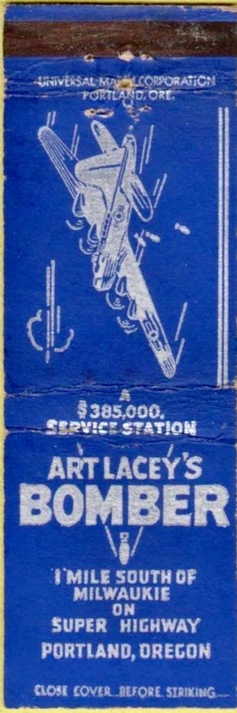 Art Lacey was Oregon-born in 1913. He was a logging camp cook and then worked for the Army Corps of Engineers in WW II. In 1947, this young pilot opened a service station in Milwaukie, Oregon, a bit south of Portland. You’ll note the matchcover says it’s on “Super Highway” — that’s what they called McLoughlin Boulevard, or Oregon Route 99. The station was Lacey’s 3rd venture with 4 gas pumps that soon grew to 40. And flying remained his passion.