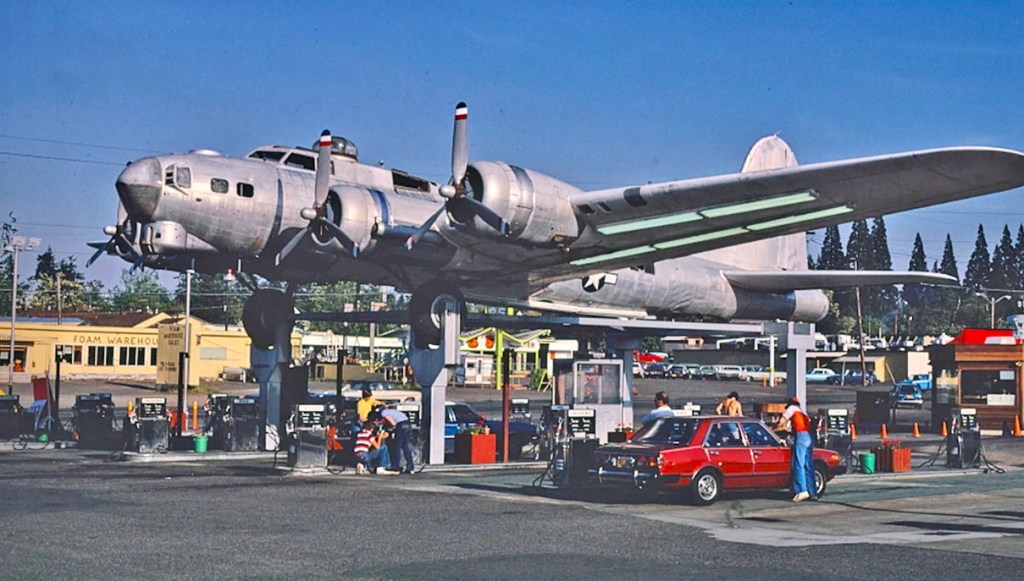 There are any number of gas and service stations that have featured an airplane in some way or another. One of the earliest was The Airplane Station in Powell, Tennessee, built, yes, in the shape of an airplane in 1930 after Lindbergh’s famous 1927 flight,. The Royal Albatross on Ventura Boulevard in L.A. was another, also in the 1930s. Then there was Art Lacey’s Bomber.