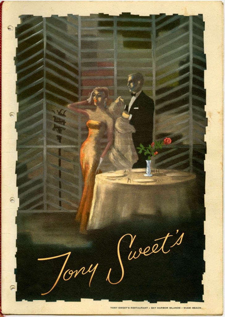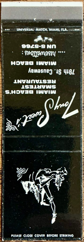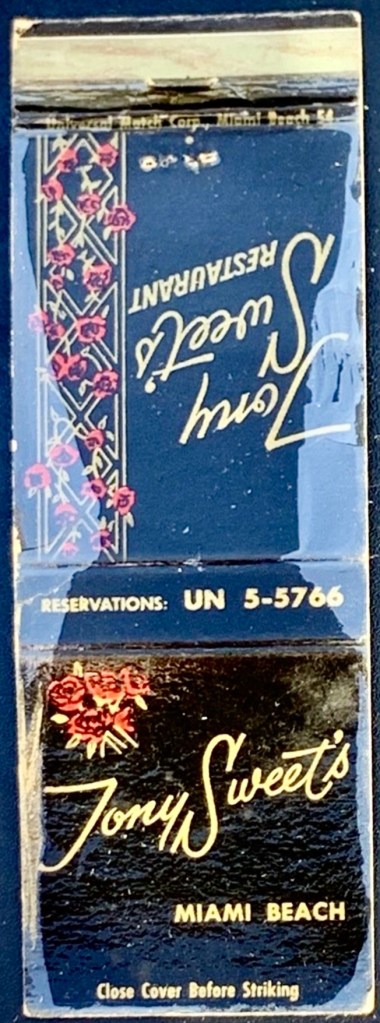 I do know there are at least two different covers for this Tony Sweet’s . I’ve seen one for Tony’s Fish market, also in Miami and owned by these two. This restaurant was said to be a great steak house and an attractive elegant place to eat. But when it opened, closed and who ate there….our digital world is just not giving up those parts of the story — not yet and not easily, at least!