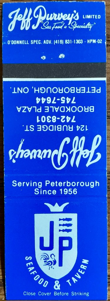 Sports at the local level might be personified in Jeff Purvey of Peterborough, Ontario. Jeff was born in Toronto in 1922. It was above a fish store his father had operated since 1919 and he never got far from that — this 20-strike matchcover is for Jeff Purvey’s Seafood & Tavern in The Electric City.* The restaurant will celebrate its 70th year in Peterborough in 2026.