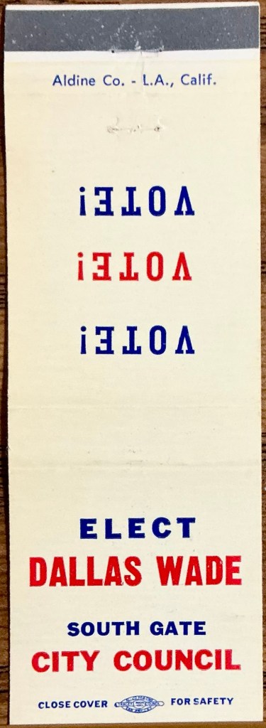 Dallas Wade’s matchcover leads us in a bit. It’s a front-strike 20-strike matchcover from a jobber in L.A. There are also some out there that were assembled inside out.