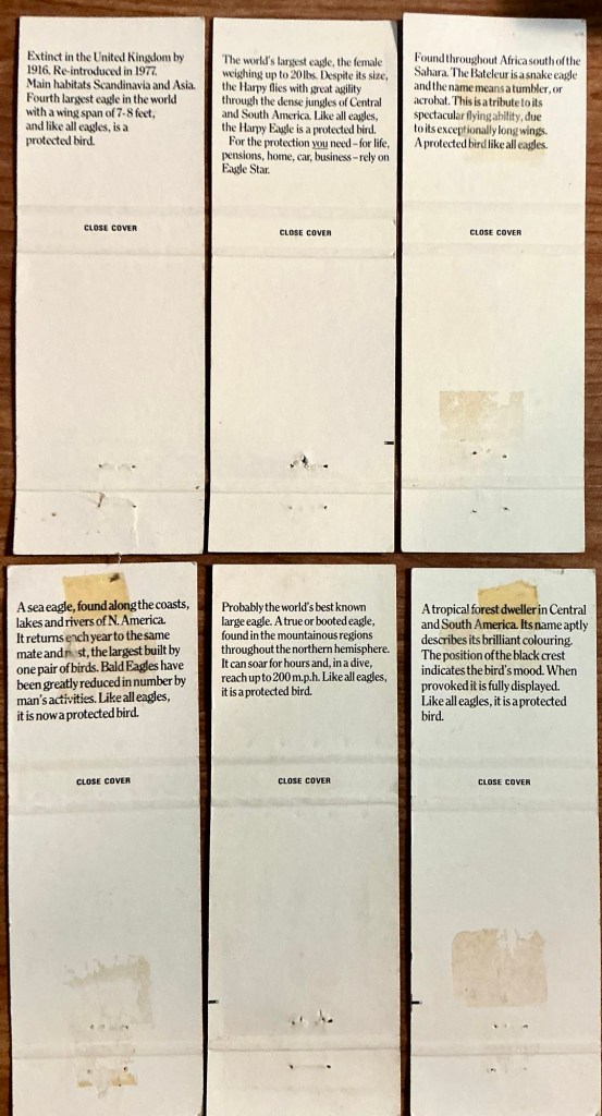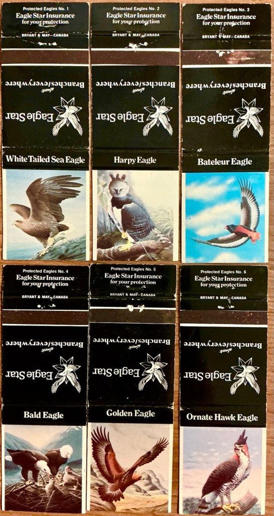 “Insurance” — this is one of those super-deep categories rich with both aged front-strike and more contemporary rear-strike matchcovers in all sizes. Here are a half-dozen of the latter; if you collect “eagles”, or just “birds” or “sets”, you’re in luck with this one. More on the covers later.
